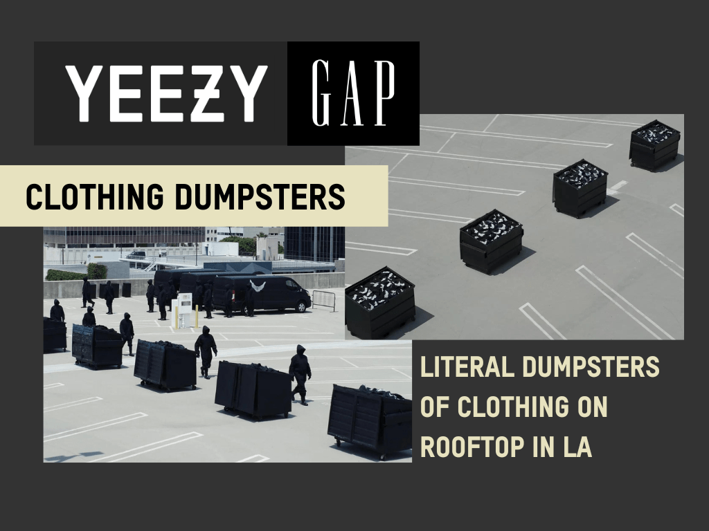 In stark contrast to the adulation surrounding the adidas Originals Popup Shop, the YEEZY x GAP Popup Shop in Times Square and LA sparked controversy and condemnation. Conceived as a collaboration between Kanye West’s YEEZY brand and GAP, the popup shop featured clothing displayed in large vinyl bags described as “garbage bags” and dumpsters situated on the roof of a parking garage.