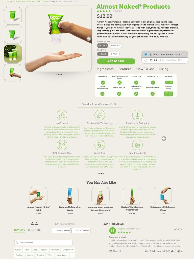 Above: A mockup I made of a product page for Good Clean Love while we were in the process of redesigning our PDPs for GCL.com. To make this, I referenced other PDP’s of competitors and other brands that I thought had solid PDP’s and took elements from each that I liked. Afterwards we worked with a website developer to bring my work to life. View my work by looking at any page on the Good Clean Love website, where I was in charge of formatting, imagery, copy, etc. for all website pages.